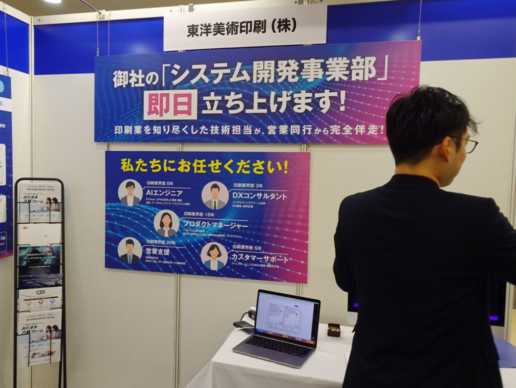 システム構築支援サービスの内容は、同社に在籍しているAIエンジニア、DXコンサルタント、プロダクトマネージャーや営業支援およびカスタマーサポートなど印刷業を知り尽くした技術担当者がチームとなって、営業動向から完全伴走する。それぞれの企業が抱える困り事に対して、最適な提案を行うべく、時にはシステム開発事業部を即日立ち上げして、取り組んでいくというもの。