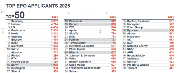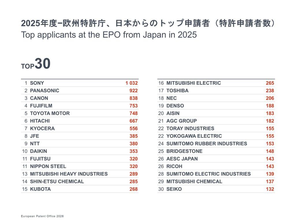 2025年の日本のEPO出願上位企業は、ソニーグループが1,032件で首位となり、パナソニック922件、キヤノン838件、富士フイルム753件、トヨタ自動車748件と続いた。EPOトップ40に入った日本企業は7社となり、2024年の6社から増加。最も大きな伸びを示したのはトヨタ自動車で、2024年の第43位から2025年には第25位へと躍進。京セラ、富士フイルム、キヤノンも出願件数を大幅に増やした。