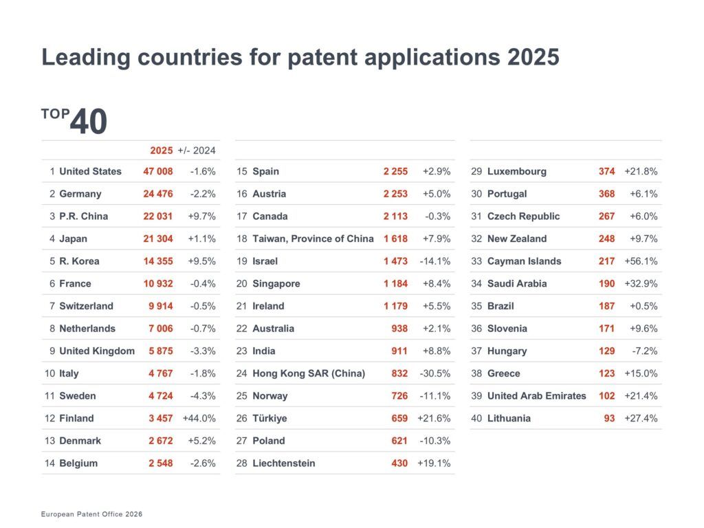 EPOによると、2025年の特許出願受理件数は過去最多の20万1,974件で、初の20万件超えを記録。欧州(EU27)からの出願は0.7%増、欧州外からの出願は2.1%増で、前年から平均1.4%増となった。
