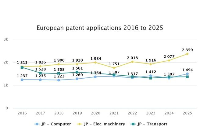 欧州特許庁 『EPO テクノロジー・ダッシュボード 2025』公開 出願国ランキングで日本は第4位 電池や自動車などの主要分野で出願増