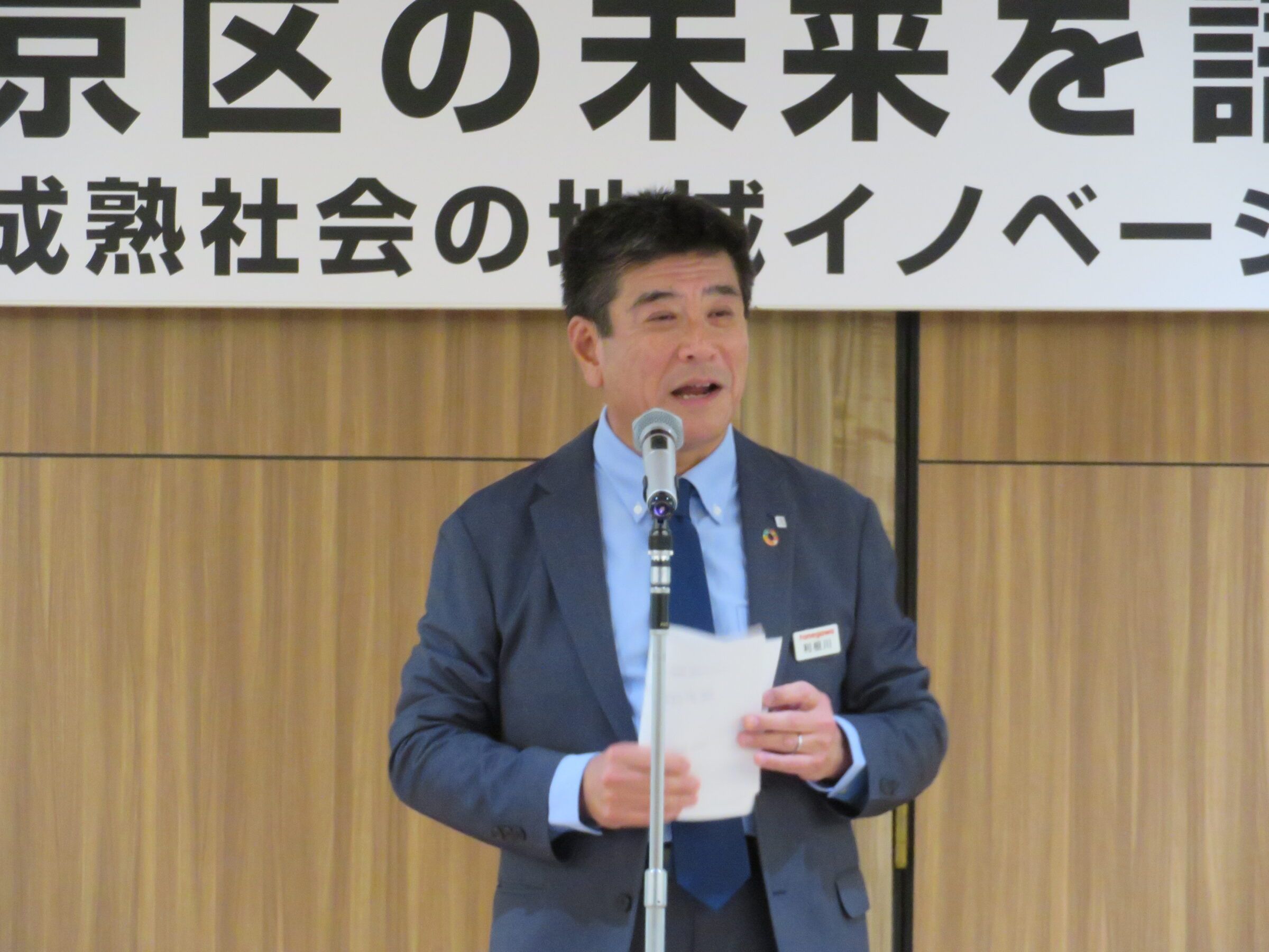 主催者を代表して一般社団法人マーチング委員会・湯島本郷マーチング委員会の利根川英二氏(株式会社TONEGAWA代表取締役社長)が登壇し挨拶した。「おかげさまで100号、15年かかりました。ネットやYouTubeなどを絡ませながら作り上げ、多くの方々に協力いただきました」と感謝を述べた上で、「本日は“聞く”だけでなく“語る”場にしていただきたい。経営者として、住民として、文京区に関わる一人ひとりの視点が、未来を切り拓く力になります」と語った。