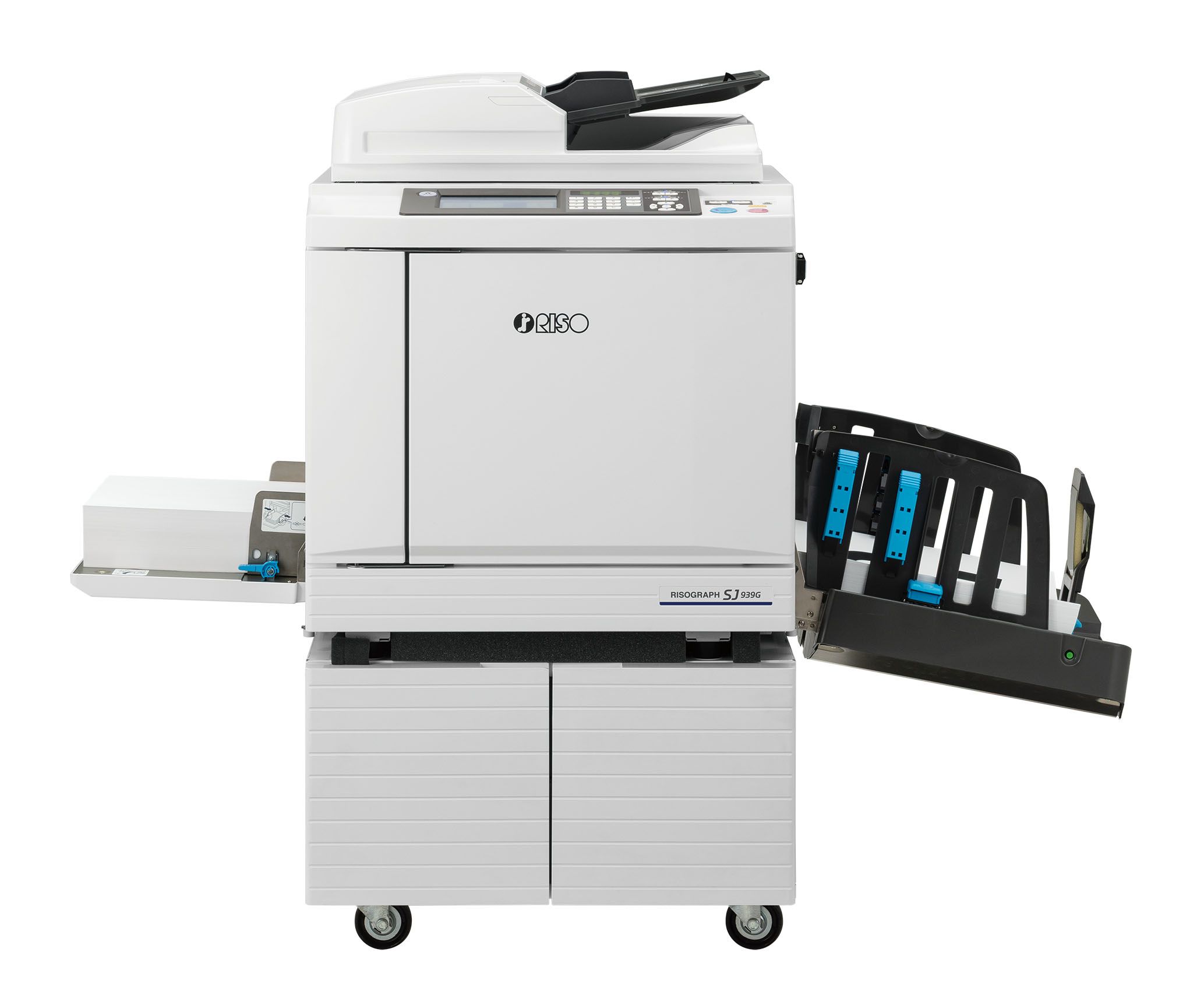 『リソグラフSJ939』、『リソグラフSJ939G』は、ハガキからA3サイズまでの全サイズで、毎分200枚の高速印刷が可能。薄くて腰のない更紙(46g/㎡)のような用紙を使用する場合にも対応する。学校での教材やお知らせ、不動産やスーパーのチラシなど多枚数プリントを高速で処理できる。