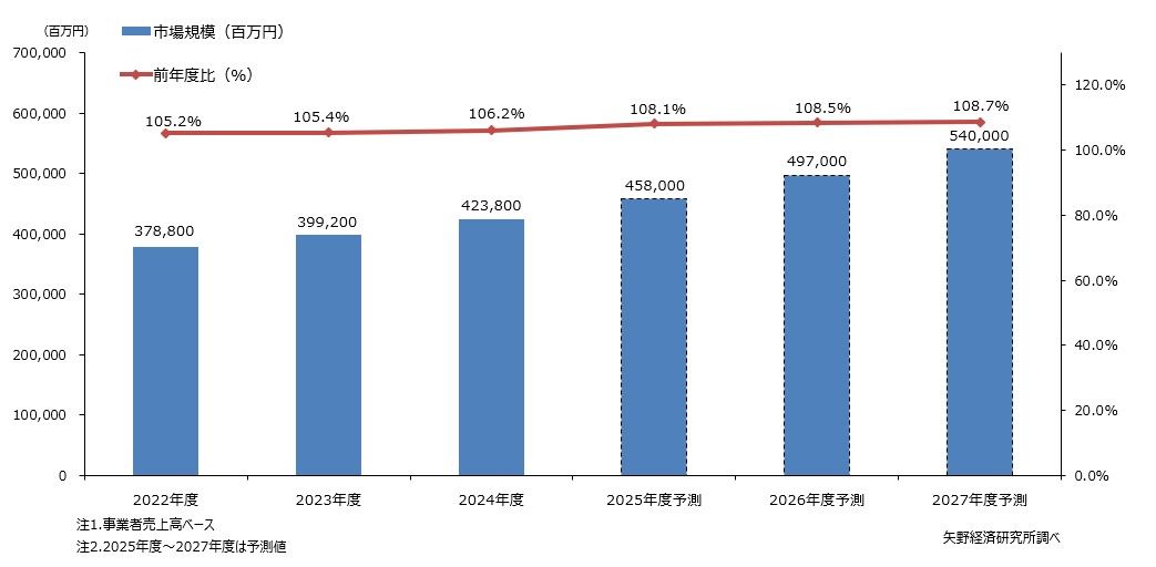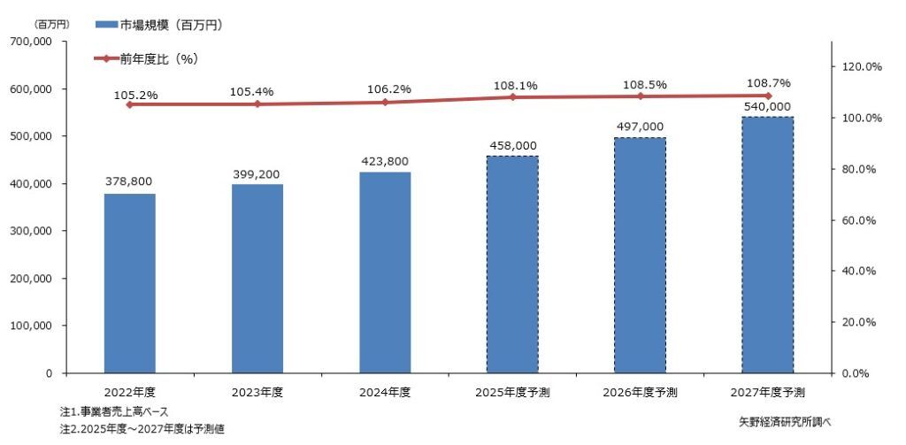 一方、国内動画制作サービス市場は、2024年度に前年比106.2%の4,238億円と推計。YouTubeやTikTok向け動画制作が好調に推移し、企業によるブランディング目的の動画需要や大阪・関西万博関連広告が市場拡大を後押しした。2025年度はさらに成長し、前年比108.1%の4,580億円に達する見通し。