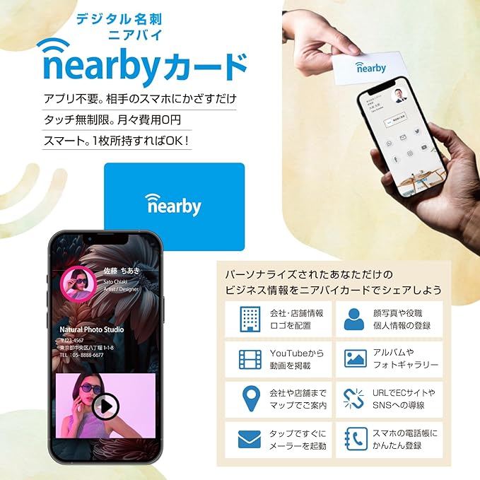 デジタル名刺「Nearby Card」は、スマートフォンをカードにかざすだけで、連絡先やSNS、Webサイト、動画などを瞬時に共有できる新しい名刺の形。NFC(近距離無線通信)チップを内蔵し、専用アプリをインストールせずに使える利便性が特長となっている。