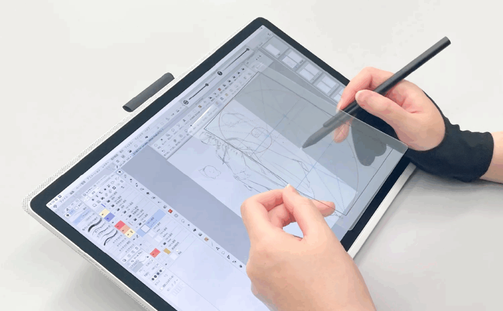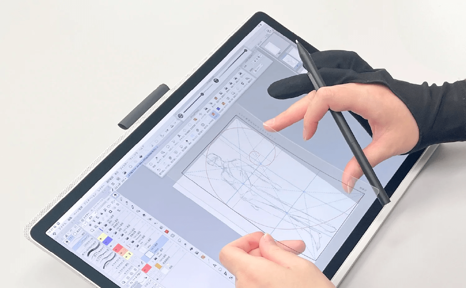 三分割法については対角線を用いた三分割線を採用した。クリア素材のため、原稿やラフに重ねて比率を直接確認しながら作業を進められ裏面からも線が見える。