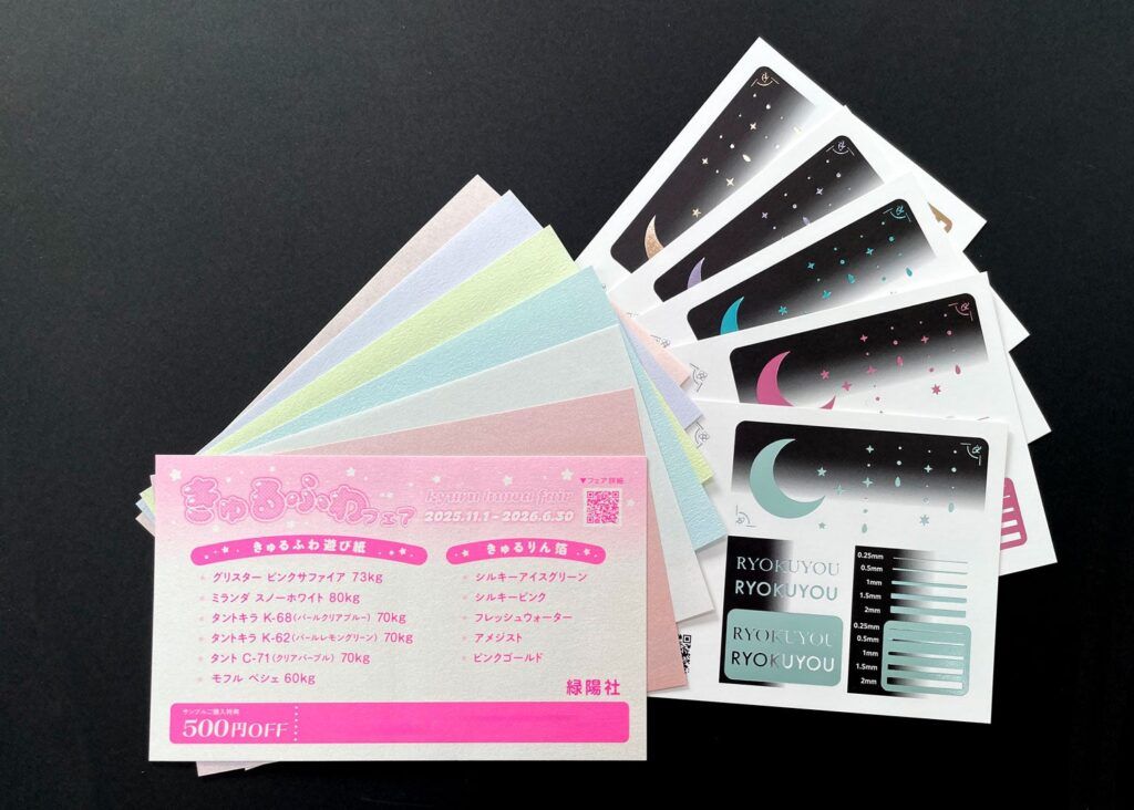 緑陽社公式BOOTHでは、同商品のほかにも「きゅるりん箔&遊び紙見本セット」や「虹のかけらノートアソート」「未さらし手帖(BOOTH限定ノベルティ付き)」など、創作活動を支えるオリジナルグッズを多数取り扱う。いずれも印刷会社ならではの素材選びや紙の質感を活かしたアイテムで、同人誌制作やデザイン業務に役立つ内容となっている。