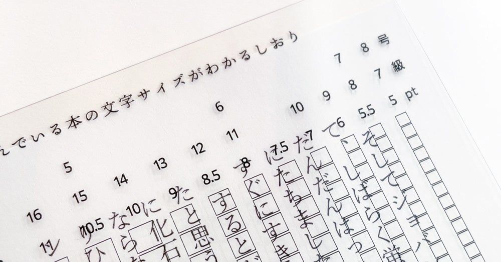 「読んでいる本の文字サイズがわかるしおり」は、透明フィルムにさまざまなフォントサイズを印刷した便利なアイテム。文字に重ねるだけでフォントサイズを瞬時に確認できる仕組みとなっている。デジタル原稿作成に馴染み深い「pt」表記を中心に、「級」「号」を併記。「mm」の表示もあり簡易定規としても使用できる。文庫本に挟めるサイズで持ち運びしやすく、日常使いにも適している。