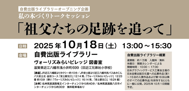 日本自費出版ネットワーク 日本自費出版文化賞応募作品1万冊を展示する(滋賀県・近江八幡市)「自費出版ライブラリー」のオープニング企画「私の本づくりトークセッション『祖父たちの足跡を追って』」 で開催【10月18日】