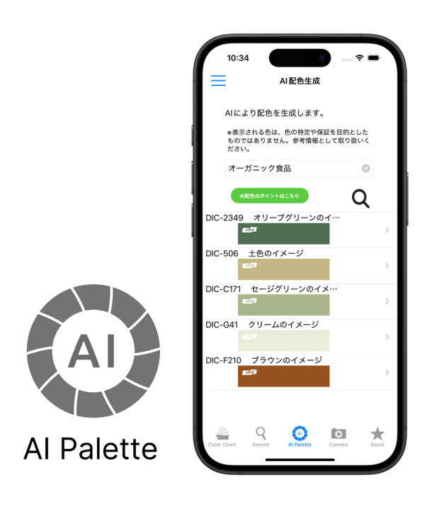 主な特徴として、AIがキーワードに関連する色と配色を自動で提示する。提案される色はすべてDICカラーガイドシリーズから選定されており、DICカラーガイドの色番号が表示される。これにより、印刷・製造・パッケージ開発といった実務へそのまま活用できる高い接続性を備えている。