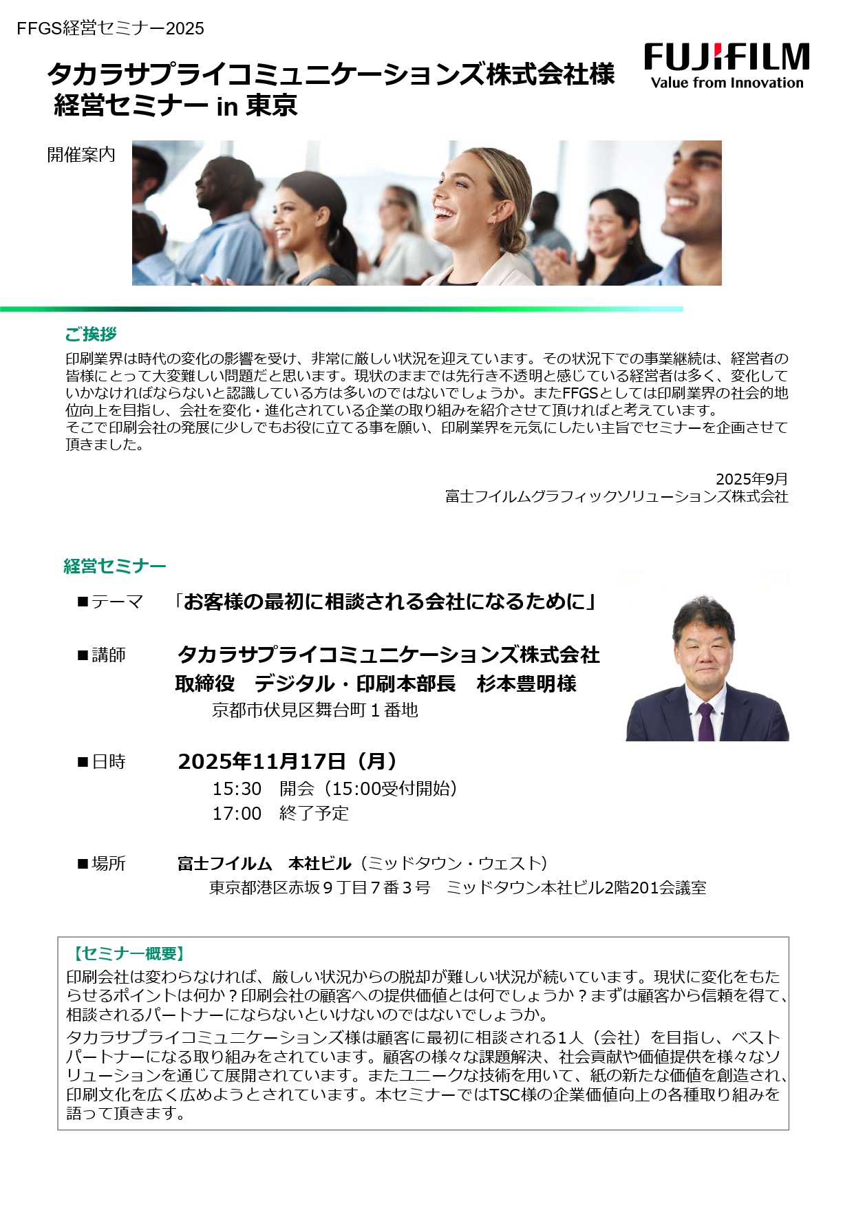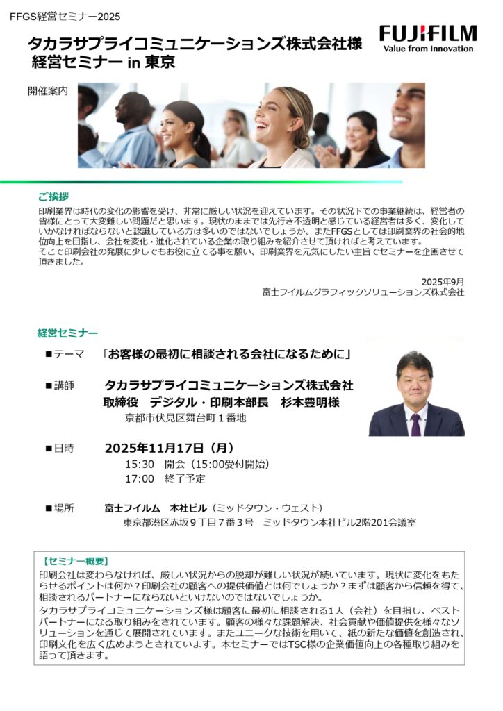 FFGS 「お客様の最初に相談される会社になるために」経営セミナーを東京・赤坂の富士フイルム本社ビルで開催 タカラサプライコミュニケーションズ・杉本氏が登壇、印刷会社の価値創造と進化のヒントを共有【11月17日】