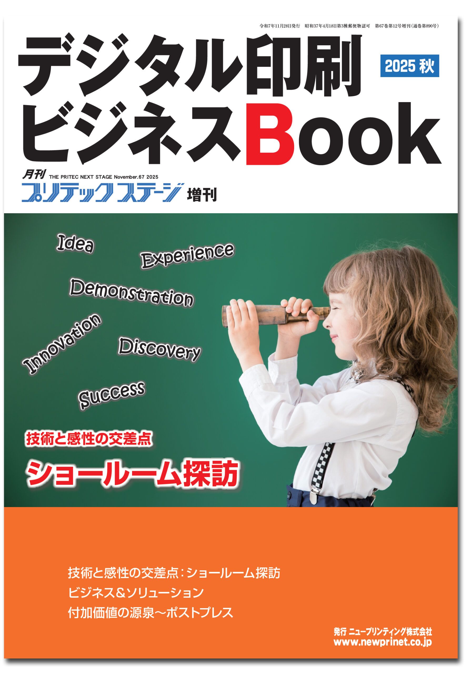 本書では「技術と感性の交差点:ショールーム探訪」をテーマに、各社ショールームの取り組みを巻頭特集として紹介しております。機器の性能確認にとどまらず、共創・検証の場としてのショールーム活用を促す内容と致しました。また、デジタル印刷の利点を活かしたビジネス開発の事例、小ロット適性を持つ後加工機器の動向も併せて取り上げ、デジタル印刷を取り巻く最新情報を紹介します。