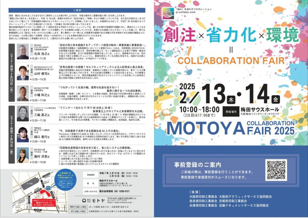 2025年2月13日から14日にかけて、梅田サウスホールで「モトヤコラボレーションフェア2025」を開催します。コラボレーションフェアは、印刷会社様の強みをアピールする場を作ることに加え、来場する印刷会社様と仲間づくりをして頂こうというスタンスで行っています。