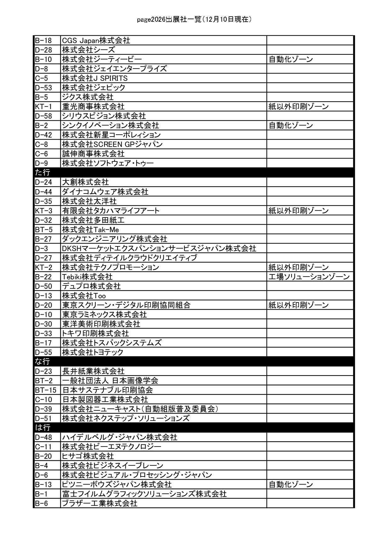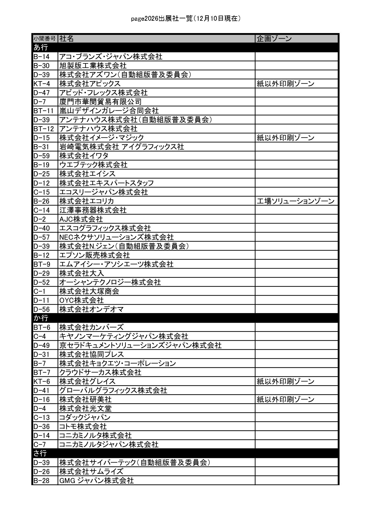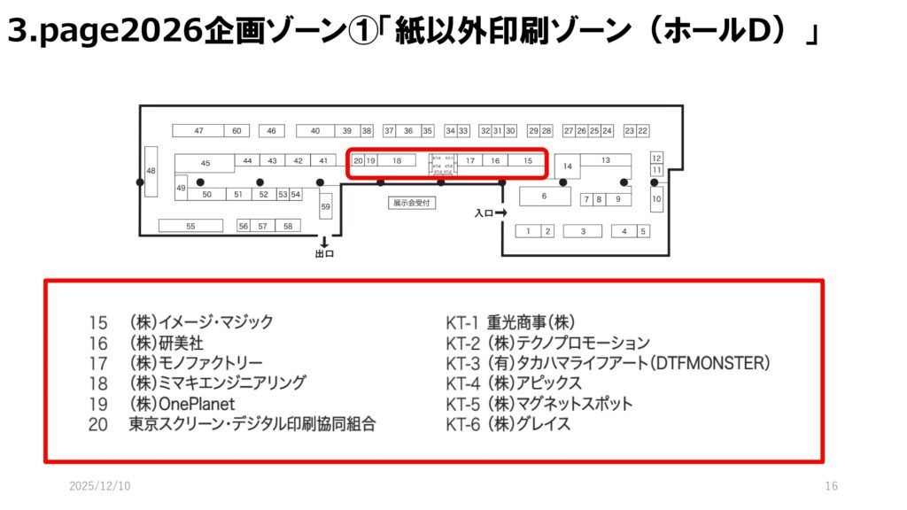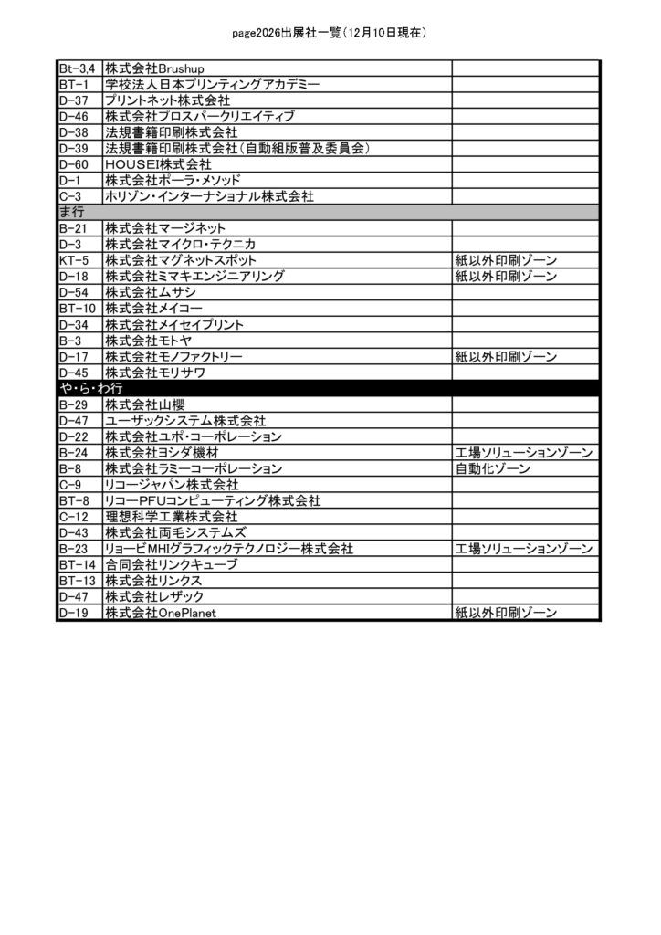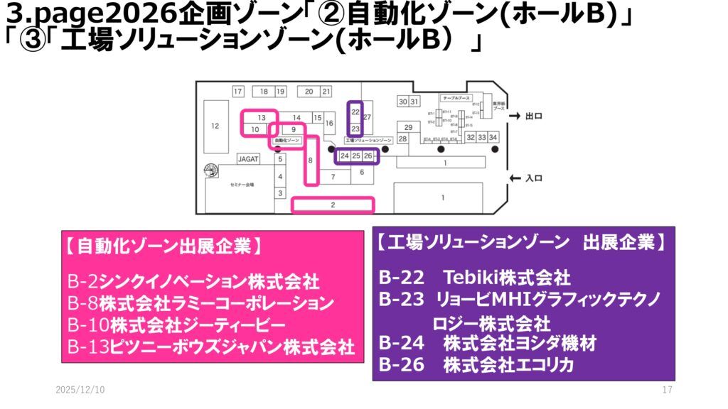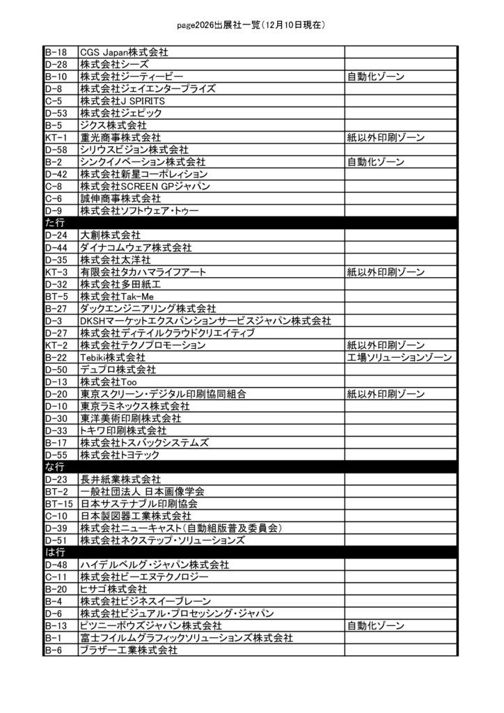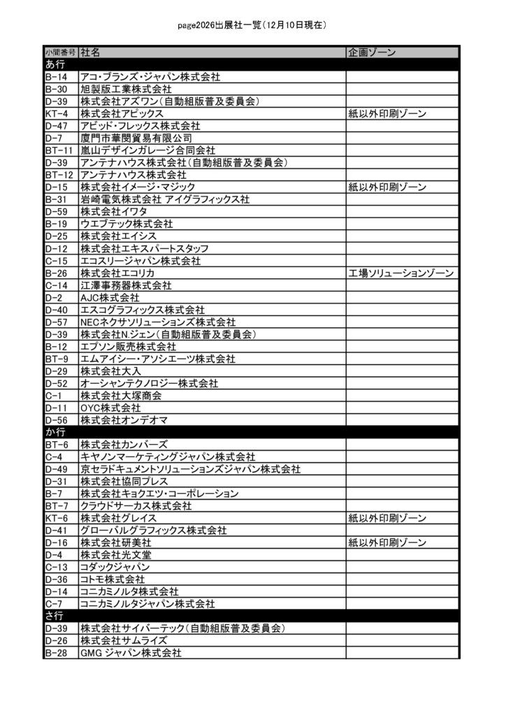page2026では、12月10日時点で128社・493小間が出展予定とされている。前回実施された「JANPS in page2025」は併催されないが、新企画ゾーンを複数立ち上げる。新たに「紙以外印刷ゾーン」「自動化ゾーン」を設置し、前回に続いて「工場ソリューションゾーン」も展開される。