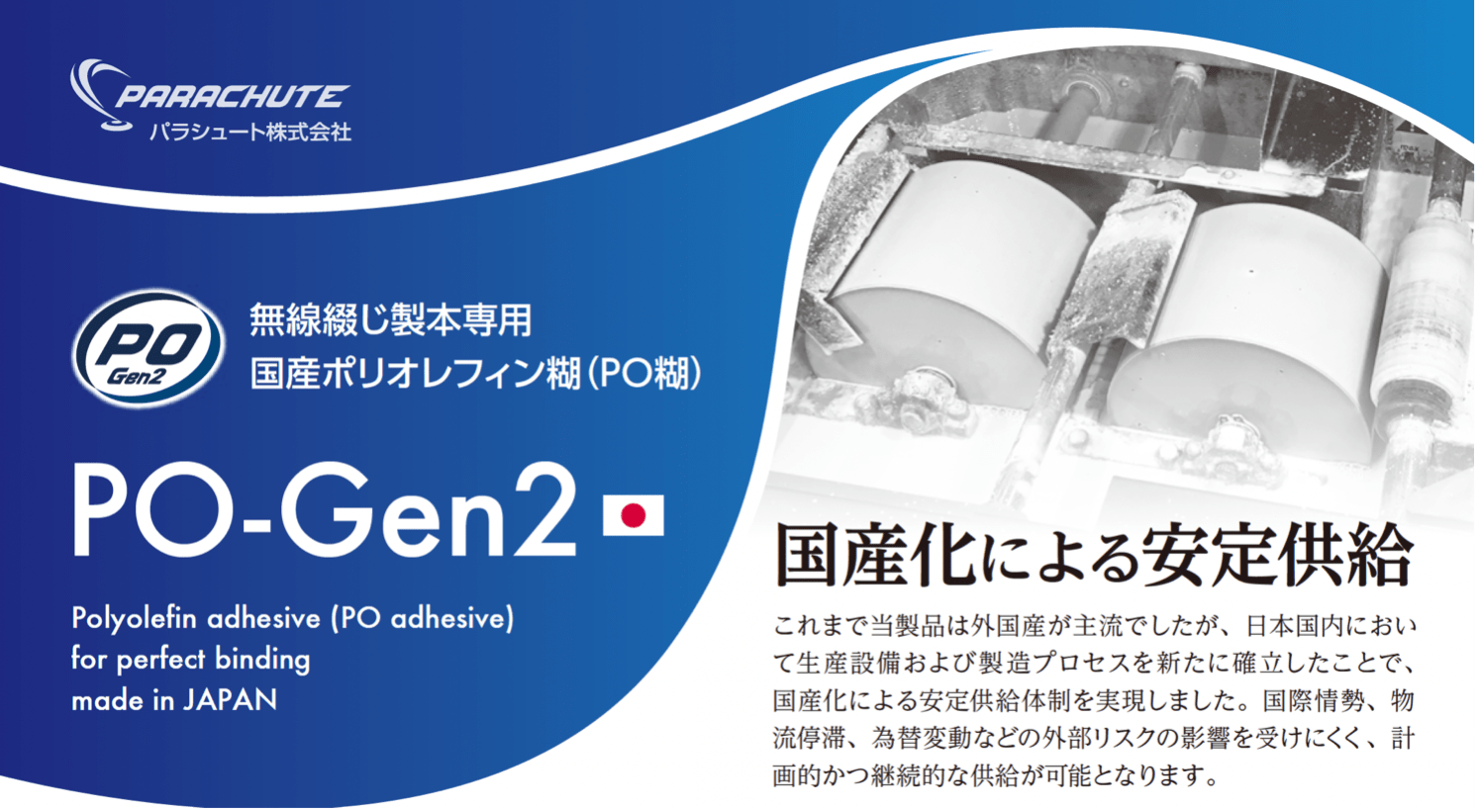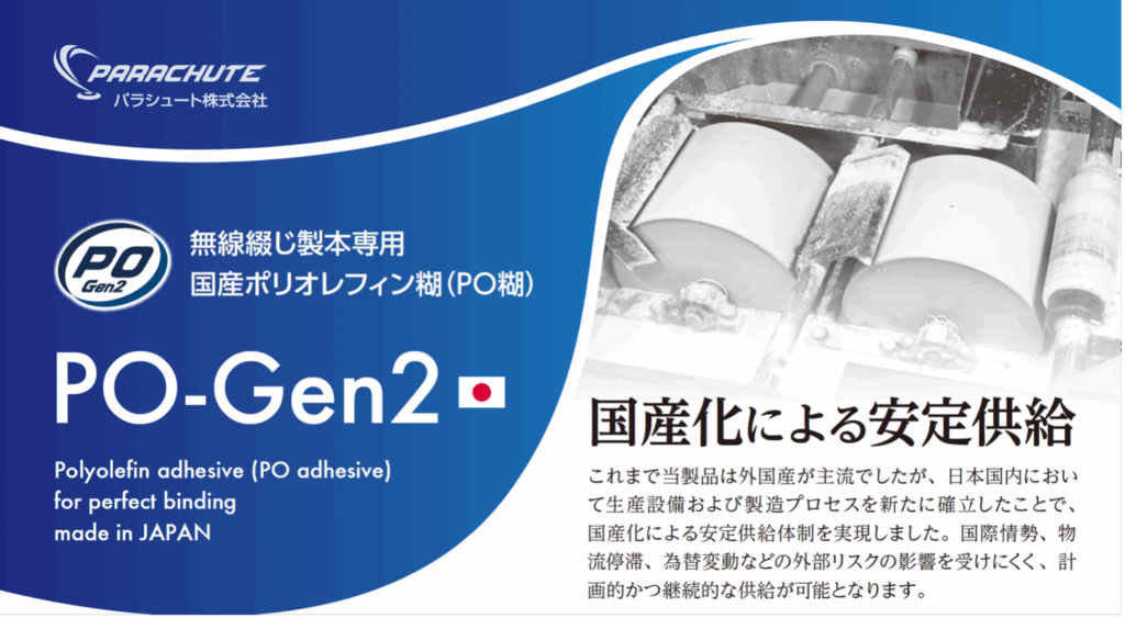 パラシュート 無線綴じ製本専用国産ポリオレフィン糊(PO糊)「PO-Gen2」販売を開始、国内製造で安定供給を実現