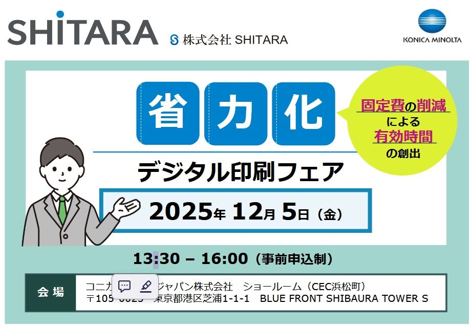 SHITARA、コニカミノルタジャパン 明日12月5日、「省力化~デジタル印刷フェア」開催~セミナーやデモで、生産性向上と最新ビジネス情報