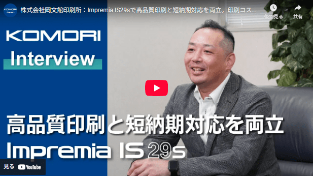 KOMORI YouTubeで新規動画「株式会社岡文館印刷所:Impremia IS29sで高品質印刷と短納期対応を両立。印刷コストの見える化により経営基盤を強化」を公開 高品質印刷と短納期対応強化、生産効率とコスト可視化を推進