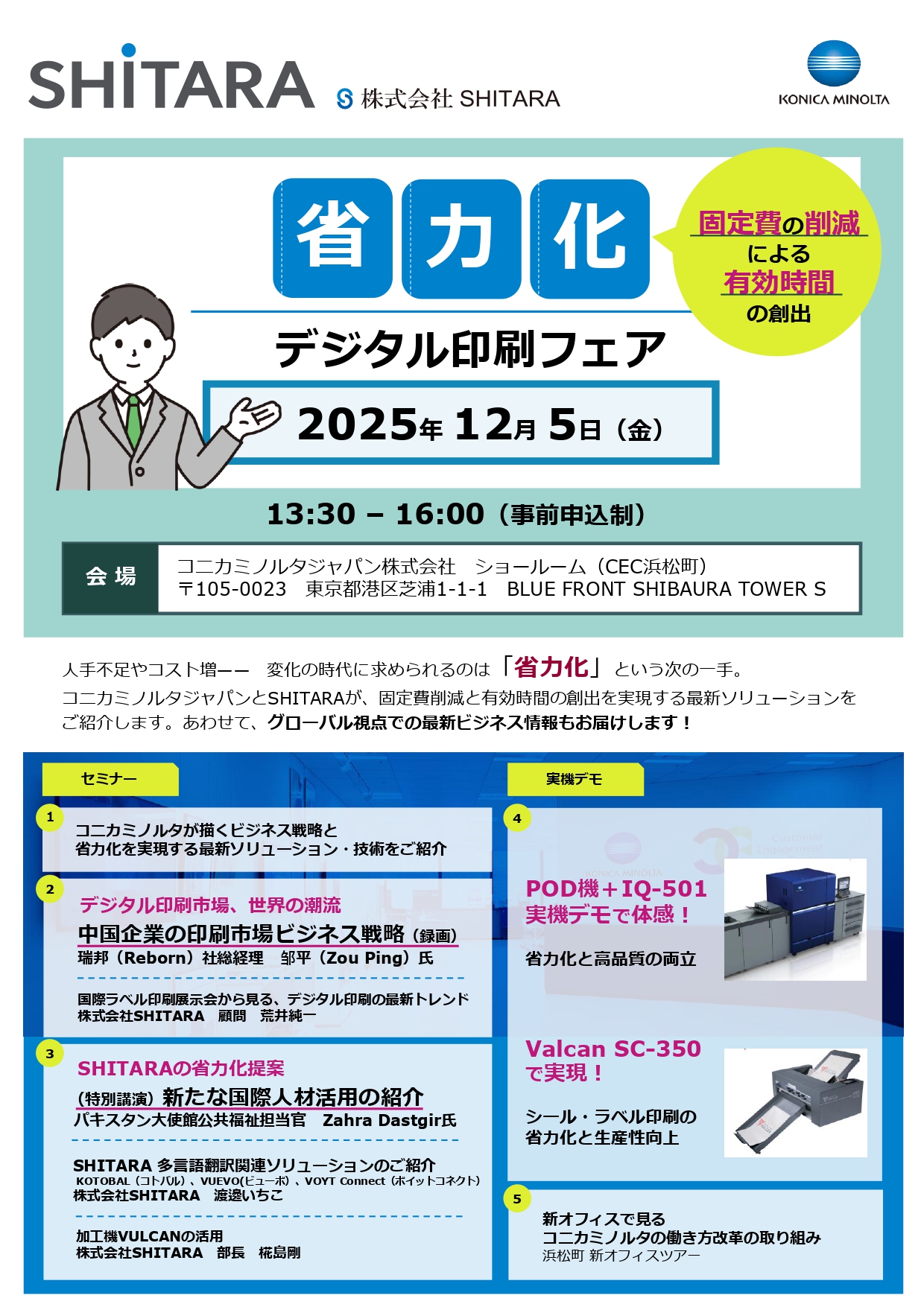 株式会社SHITARAはコニカミノルタジャパン株式会社と12月5日、東京都・浜松町にあるコニカミノルタジャパンショールームで「省力化~デジタル印刷フェア」を共催する。デジタル印刷機の紹介に留まらず、省力化をテーマに据え、海外製加工機や中国企業の戦略、Label Expoで見えたデジタル印刷の潮流、パキスタン大使館による国際人材活用の特別講演など、多面的な情報提供を行う。さらに、コニカミノルタジャパンが新たに開設した最先端オフィスを公開する。