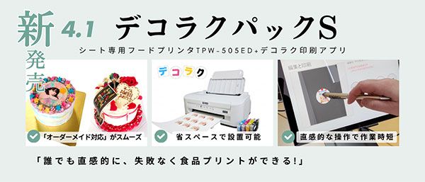 株式会社SO-KENは、最新の可食シート専用プリンター「TPW-505ED」と、誰でも直感的に操作できる専用アプリ「デコラク」をセットにした「デコラクパックS」を発売する。初回限定価格は39,600円。「写真ケーキ」などのオーダー業務の最適化に寄与する。