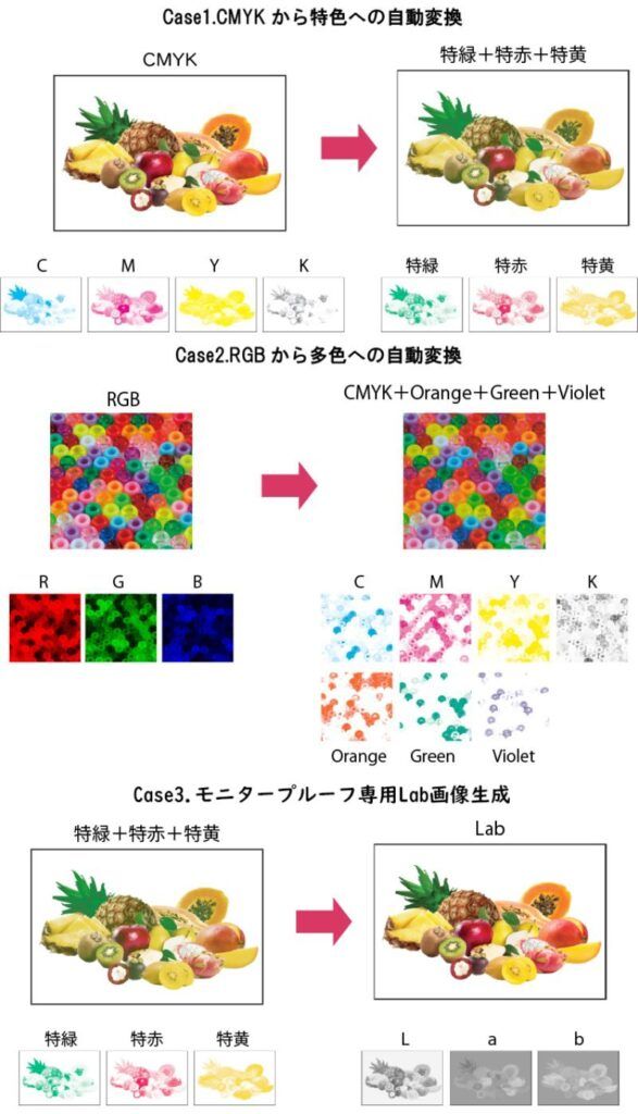 マルチカラーの色分解の自動化もできるため、品質の安定化と効率化が期待できる。パッケージ印刷におけるマルチカラーの色変換において高品質化もでき、マルチカラーのプロファイラー「GMG OpenColor」と色変換サーバー「GMG ColorServer」の連携で最大7色の広色域な印刷が可能になる。