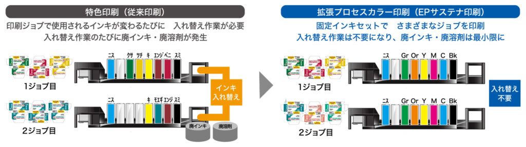 近年、環境意識の高まりに伴い、印刷業界においても持続可能性を重視した技術革新が求められている。その中で注目されているのが、特色インキを使用せずに多彩な色彩表現を可能にする「特色レス印刷」である。当社は、特色レス印刷ソリューションとして「EPサステナ印刷」を提供している。