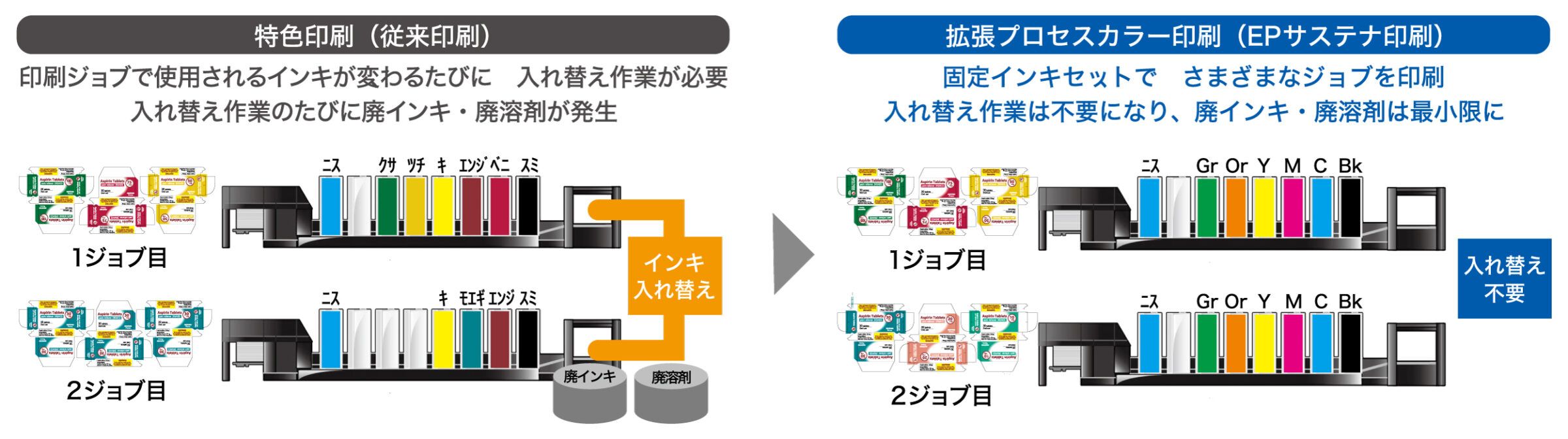 このような特色レス印刷の潮流は、製薬業界にも波及している。大手製薬会社は、国内製品の二次包装印刷において、特色インキからCMYKインキへの切り替えを進めており、環境負荷の低減と印刷工程の効率化を図っている。こうした動きは、業界全体における持続可能な取り組みの一環として注目されている。