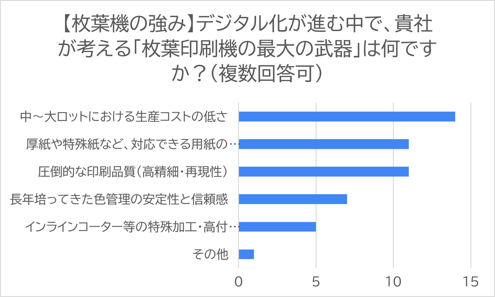 「【枚葉機の強み】デジタル化が進む中で、貴社が考える「枚葉印刷機の最大の武器」は何ですか?(複数回答可)」の回答で最も多く挙げられた項目は「中〜大ロットにおける生産コストの低さ」(14票)、次いで「圧倒的な印刷品質」(11票)、「対応できる用紙の幅広さ」(11票)となった。