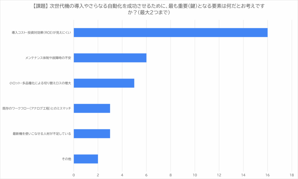 また、「メンテナンス体制や故障時の不安」(6票)や、「小ロット・多品種化による切り替えロスの増大」(5票)にも票があつまり、導入後の運用面に対する懸念も一定数見られた。