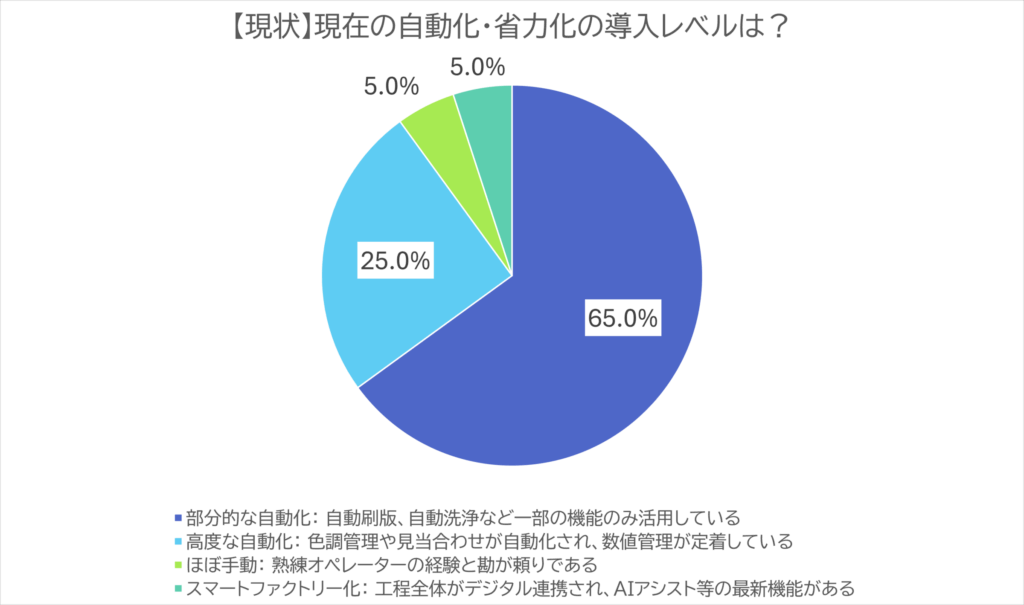 「【現状】現在の自動化・省力化の導入レベルは?」という設問では、「部分的な自動化」が65%と最多を占め自動化の途上にあることが示された。
