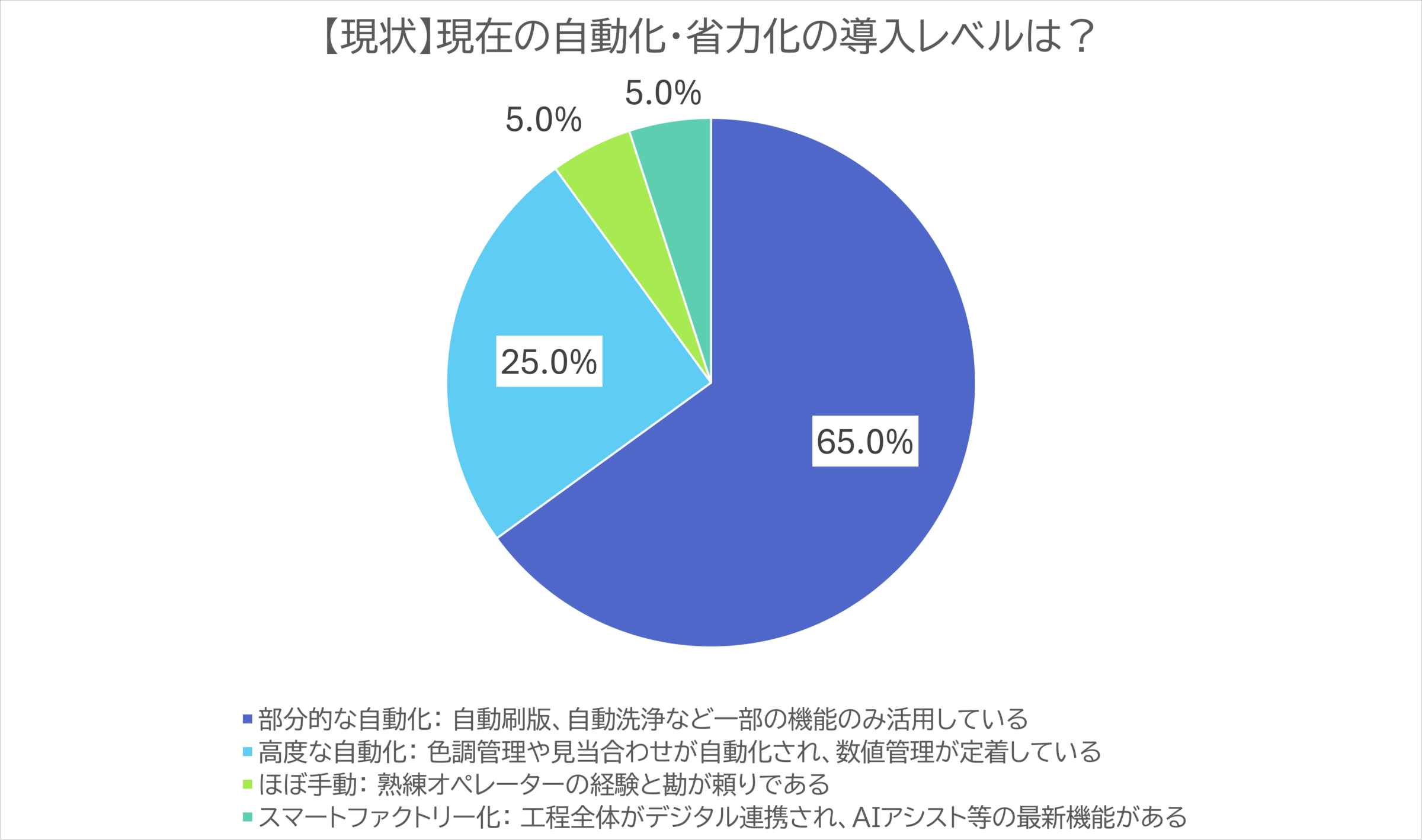 ■現在の自動化レベル:「部分的な自動化」が主流、スマートファクトリーは一部にとどまる