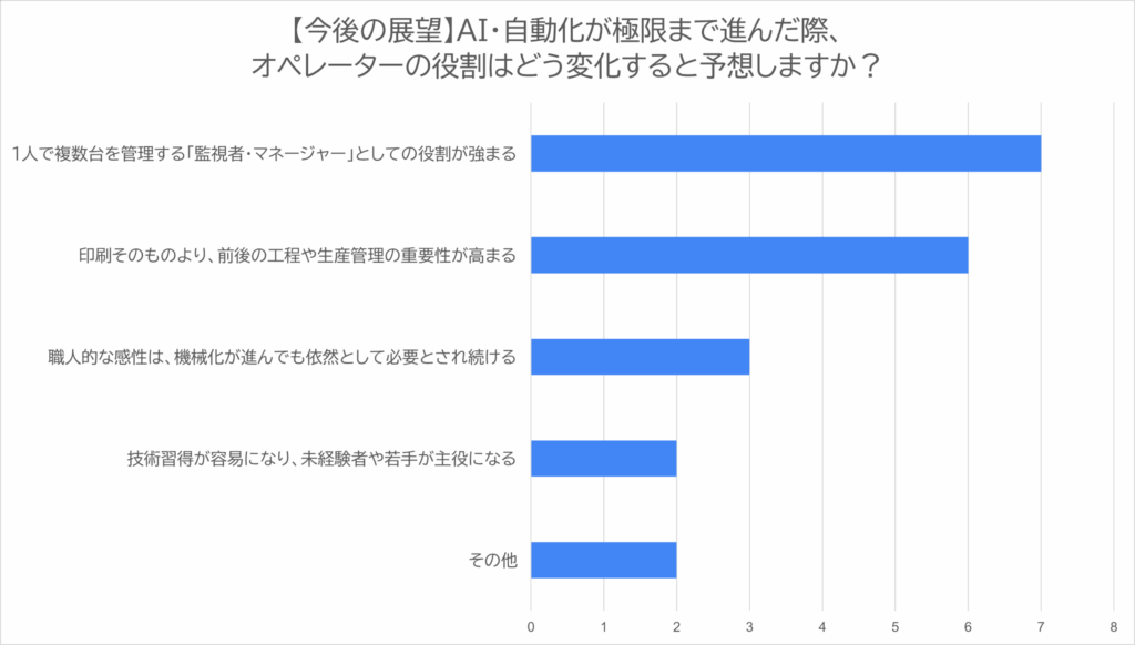 その他の項目では「オペレーター人材の労働価値の低下」も挙げられたが、「品質管理、色調管理をAIで補助しながらも機器管理は経験のあるオペは必須である」という回答もあり、現場作業者としての職人像から工程全体を俯瞰するマネジメント人材へと役割が変化するという認識が共有されていることが読み取れる。