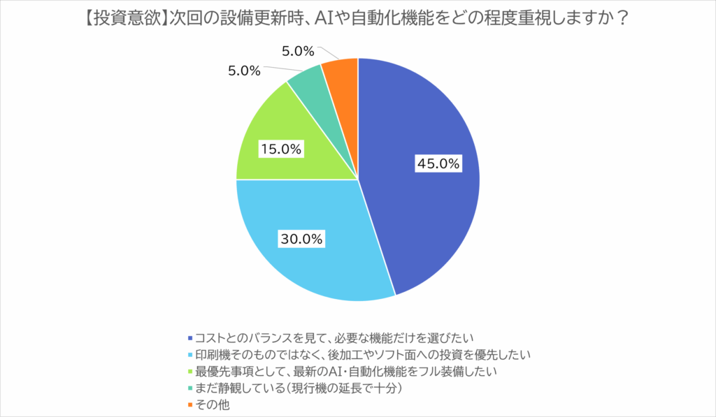 次回の設備更新では、印刷機本体のフル装備を望む声は15%に過ぎない。代わりに「必要な機能の厳選」や「後加工・ソフト面への投資」が重視されていることが分かった。