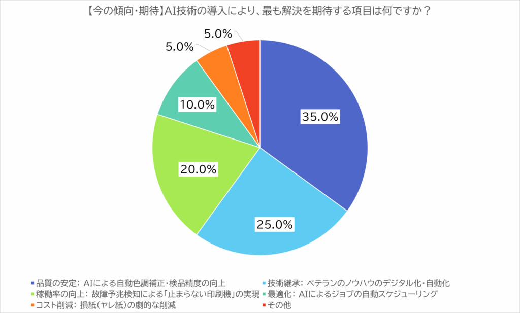 「【今の傾向・期待】AI技術の導入により、最も解決を期待する項目は何ですか?」という設問では、「品質の安定(自動色調補正等)」が7票(35%)で最多となり、次いで「技術継承(ノウハウのデジタル化)」が5票(25%)を占めた。