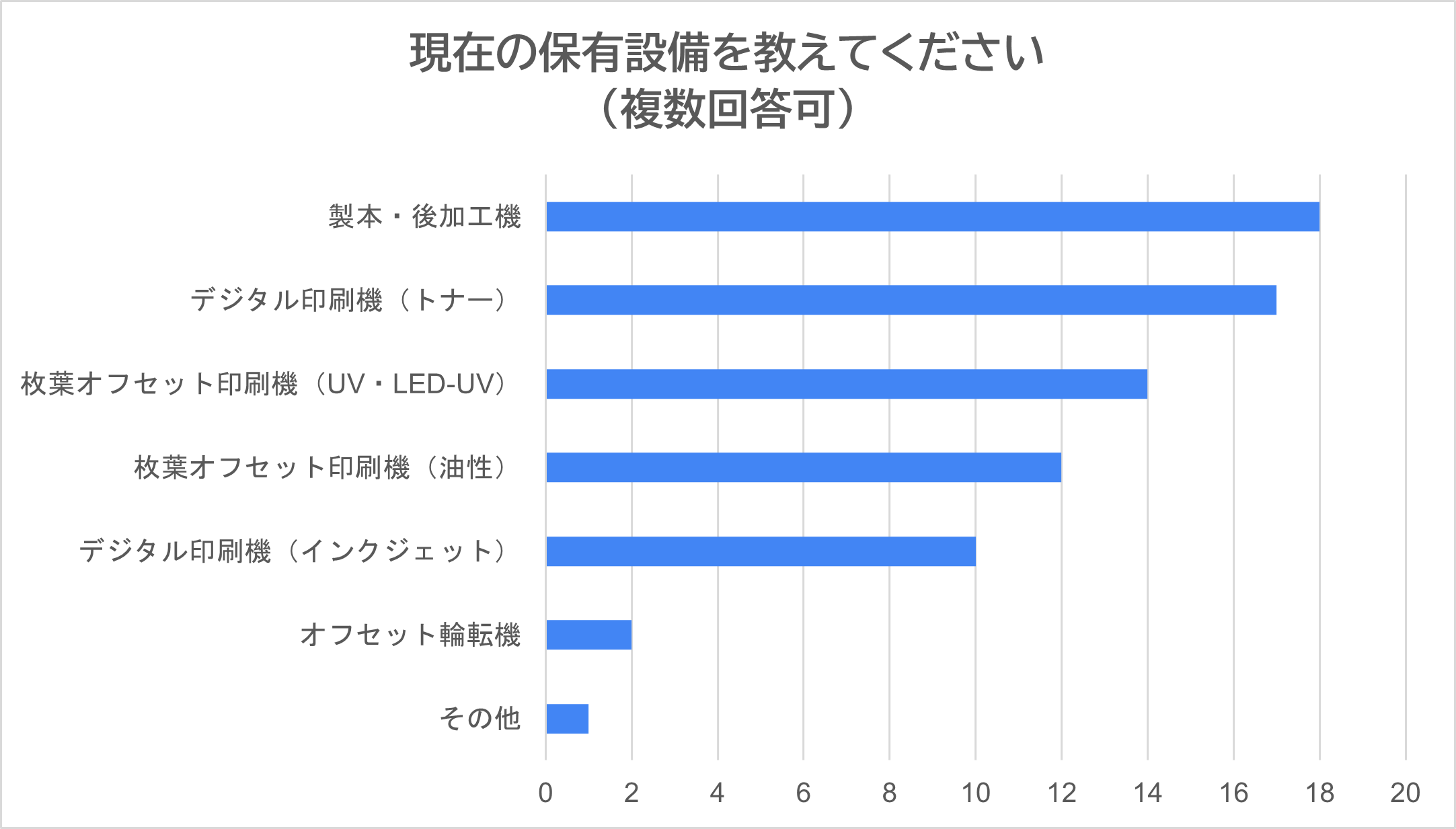「現在の保有設備を教えてください(複数回答可)」という設問の回答からは「製本・後加工機」を併設している企業が18社あった。また、「枚葉オフセット印刷機」と「デジタル印刷機」の併用体制が定着していることが明らかになった。