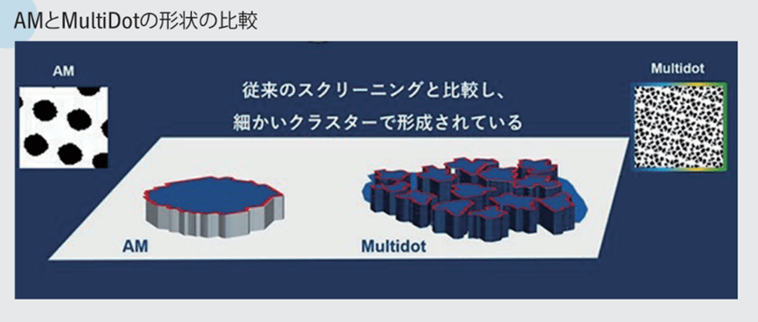 同技術は、最適化された異なるサイズの「クラスター」を持つマルチクラスター構造が特徴。これは印刷ドットを規則性のある小サイズのグループに集約するテクノロジーで、スクリーンの間隔や角度といった従来のスクリーニングの性質を維持しながらも、特徴的なドット形成により従来比で20%のインキ使用量削減を可能にする。これにより、環境負荷軽減とコスト削減を実現する。