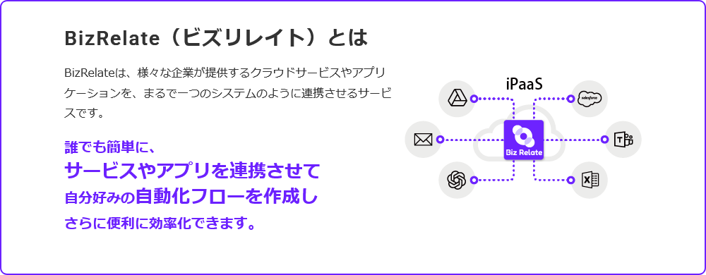 『BIZ RELATE』はAPIを利用することで、複数のシステムやアプリケーション、クラウドサービスを統合し、データ利用を効率化するサービス。複数のシステム間でデータ形式が異なる場合でも、ノーコードでデータを変換して連携させることができる。しかも国内外を含めて200種以上のシステムに対応。これにより業務フローの自動化や効率化を実現する。