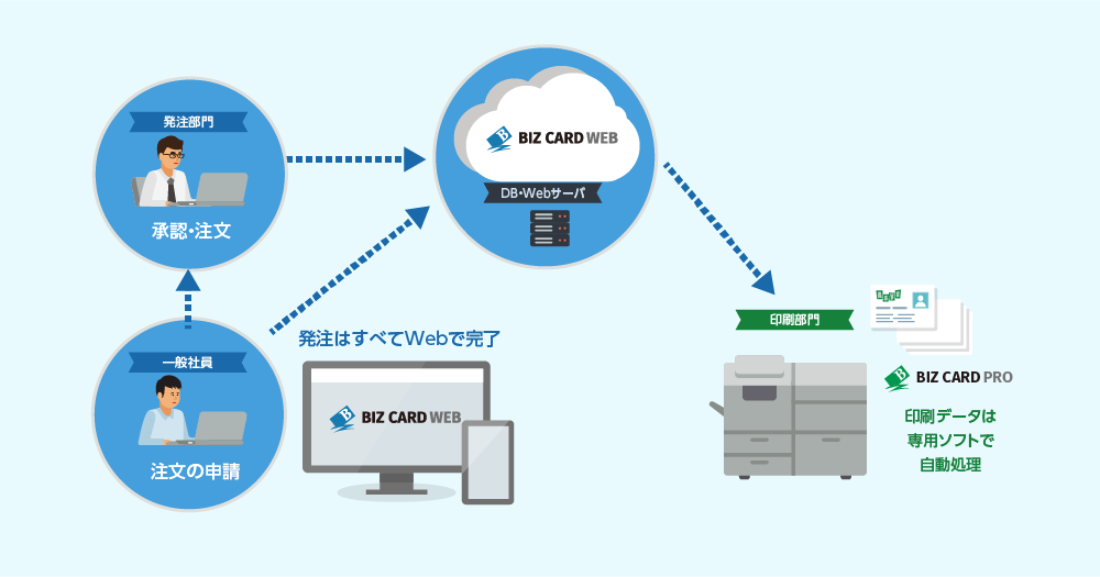『BIZCARD PRO』は、インターネット受注システム『BIZCARD WEB』との組み合わせにより、簡単にウェブ・トゥ・プリントシステムを構築することが可能。印刷物の発注者がブラウザ上で注文をするためのWeb受発注ソリューションで、名刺の発注業務を効率化する。受注側は、ワークフローの自動化とWeb化による経費削減や顧客満足度の向上を実現できる。