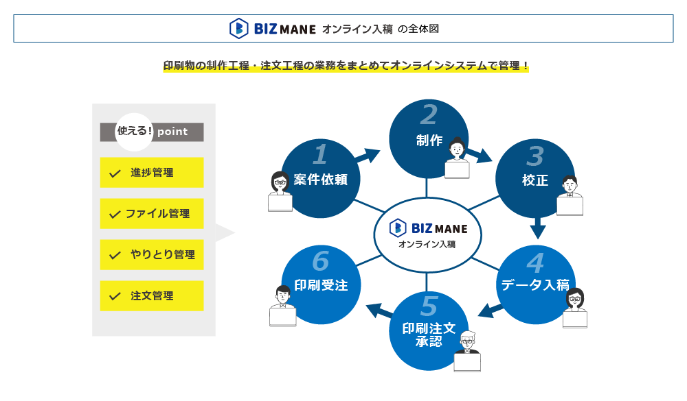『BizMane』は1つのツールで作業依頼、校正やりとり、入稿・印刷注文、進捗管理、ファイル管理を可能とするオンライン入稿システム。印刷物制作進行から印刷注文までのフローをWebブラウザだけで管理するため、複数の関係者が関わる場合でも場所や時間の制約が解消され、作業工程の最適化を図ることができる。会場ではデータ入稿形式の印刷物の受発注を中心に、データ管理や校正機能を持ったツールとして紹介する。