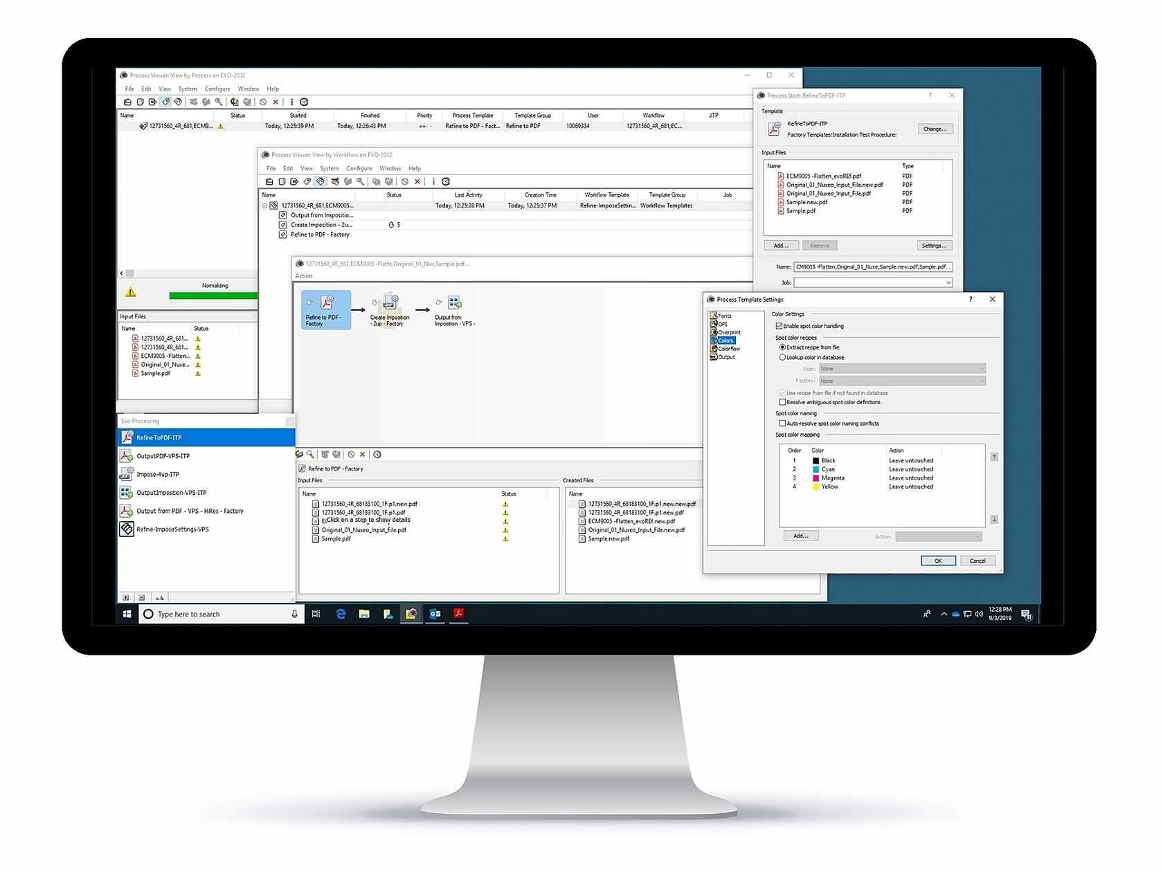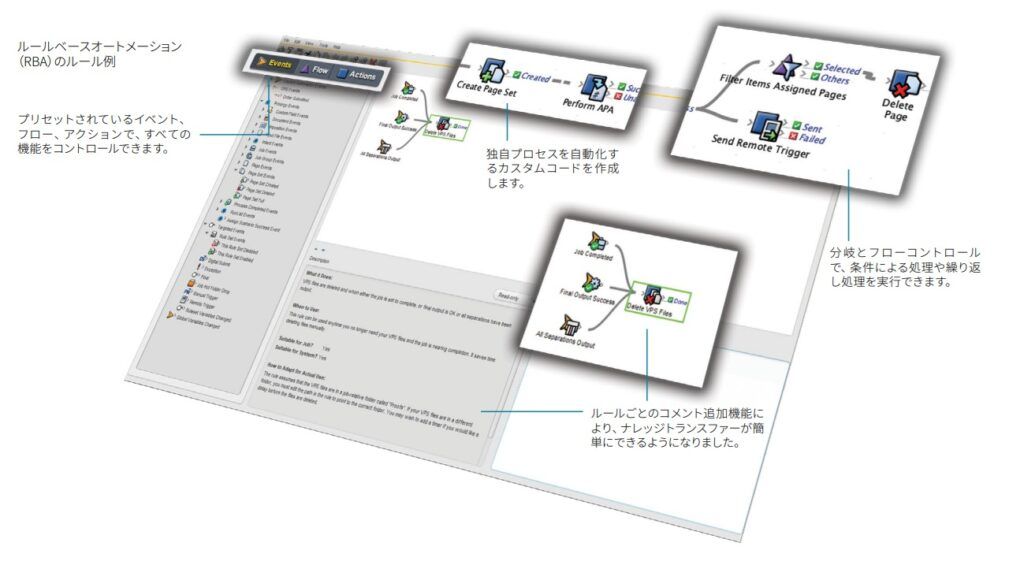 星 PRINERGYは、入稿から出力までを一気通貫で処理するワークフローシステムです。その中核となるのが「ルールベースオートメーション(Rule-Based Automation)」、略してRBAと呼ばれる機能です。ジョブが入稿された瞬間から、プリフライト、面付け、出力まで、あらかじめ設定されたルールに従って自動的に処理を進めます。人が都度判断しなくても、定型化されたジョブであればボタン一つで工程が完結します。