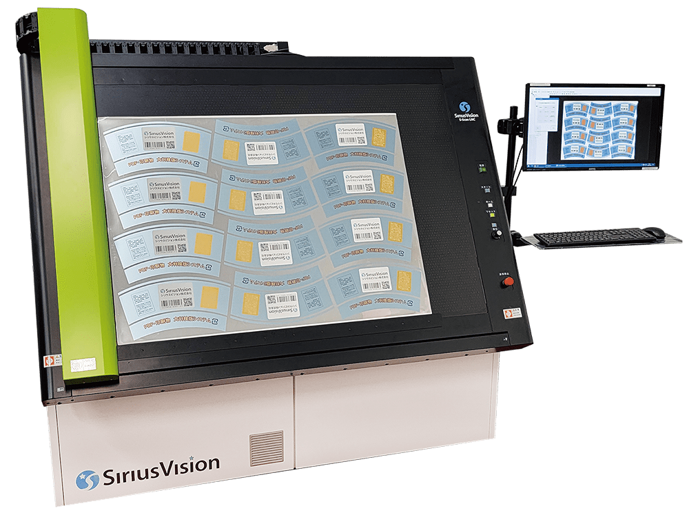 非接触型 大判検版機「S-Scan LNC」は エアー吸着により薄いフィルムも容易にセット可能。業界最速クラスとなる5秒のスキャン時間を実現しており、オプションで色差ΔE計測にも対応する。