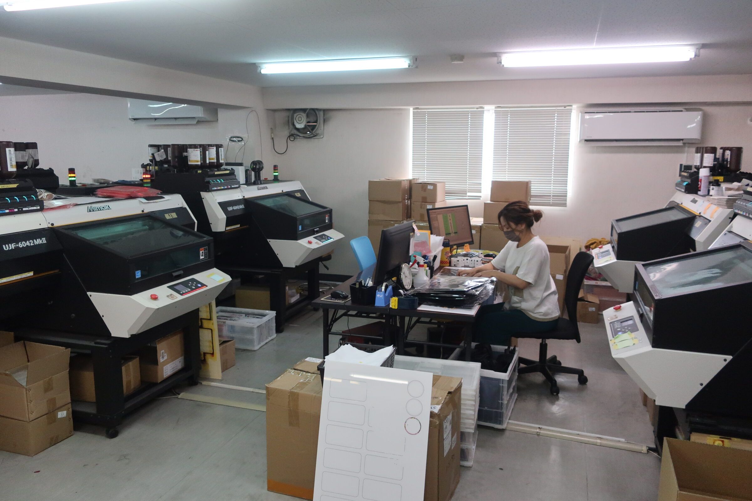 UVプリンターを1台買ってから10台、20台へと増え、スマホ1本で伸ばしました。2018年にアクリルのレーザー加工機を導入してアクリルもスタートさせました。家電量販店に売られているスマホケースを受注し、アクリルのキーホルダーや缶バッチの受注量が多くなりました。UVプリンターも40台ぐらいに増えました。その後、Tシャツのプリンター、タオルのプリンター、オンデマンドのPOD機入れて、何でも作れるようにしました。