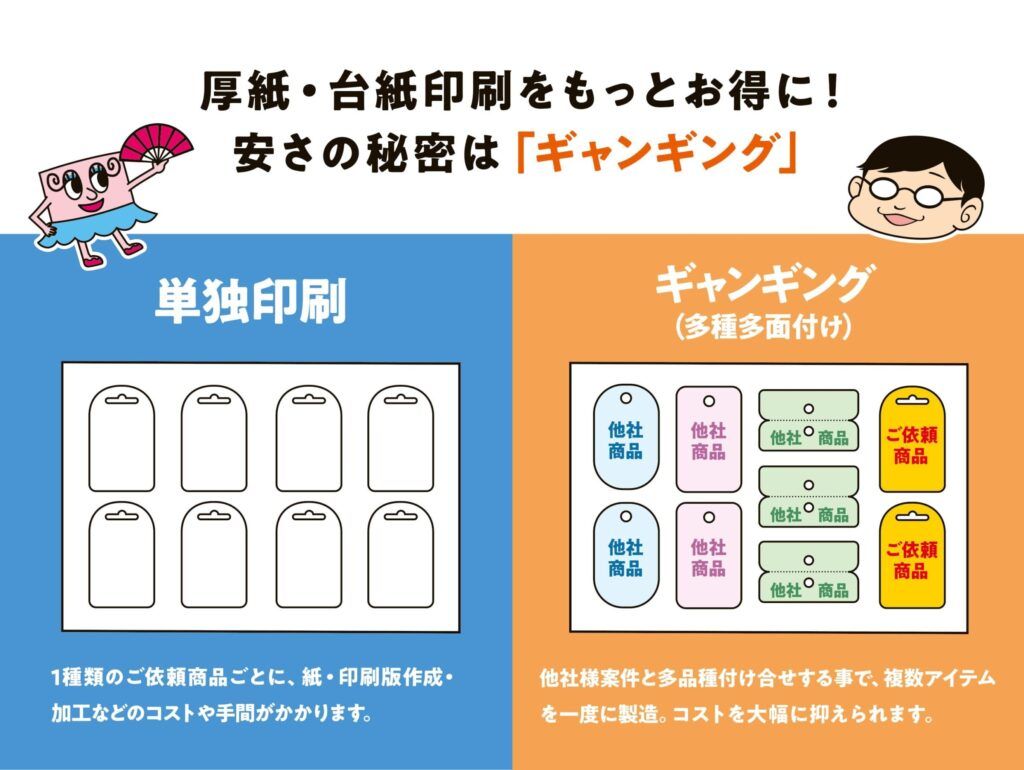 同社は長年に渡り、抜き型のギャンギングを駆使して小ロット・多品種に対応してきた。ギャンギングは複数のジョブを1つの版面に面付することで、版代を抑えて小ロット・多品種に対応させる手法。『わがままプリント』ではその手法を、型の多種多面付けに応用し、厚紙抜き加工の小ロット化を実現した。例えば、トムソン加工あり(変形台紙)で、サイズ短辺80㎜×長辺120㎜、コートカード(JET)350g/㎡の圧着ブリスター台紙が1,000部で7,560円。一般的な価格よりも圧倒的に安い。