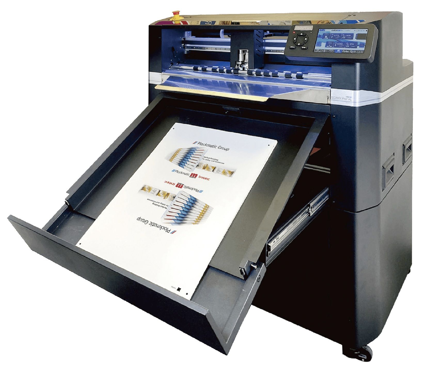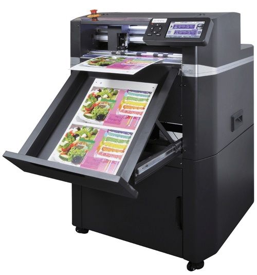 『SC7000ProT XL』はB2サイズに対応したデジタルダイカッター。デュアルツールヘッド機能(ダイカット・クリース等)を搭載し、小型化で省スペースを実現。1台でデジタルダイカット、ハーフカット、スジ入れ加工が可能。自動給排紙機構により印刷済みの用紙を積載することで連続処理し、通常のカッティングプロッターと比較して省力化を図ることができる。