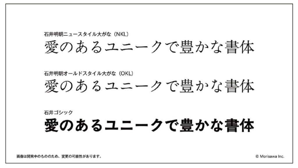 株式会社モリサワは、11月24日、IGAS2022会場のモリサワブースで行われたセミナーにおいて、現在進行中の写研書体開発プロジェクトである株式会社写研の書体「石井明朝ニュースタイル大がな(NKL)」「石井明朝オールドスタイル大がな(OKL)」「石井ゴシック」の3書体を、オープンフォントとして改刻し、2024年にリリースすることを発表した。2024年は、写植機発明100周年という節目の年にもあたる。