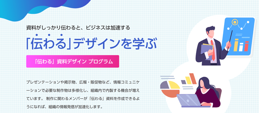 提案書やプレゼン資料など、個々の営業担当に委ねられがちな資料作成の課題を解決するプログラム。体系的に学ぶ機会の少ない「ビジネスに必須の資料作成術」を習得できる。プロのデザイナーではなくビジネスパーソンを対象とした研修であり、新入社員からベテランまで層を問わず受講が可能。