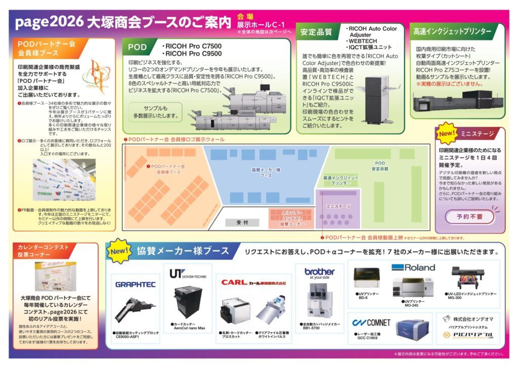 多くの来場者からの要望に応えて拡充する協賛メーカー7社の「POD+α」コーナーでは、カッティングプロッタやUVプリンター、レーザー加工機、自動カンバッジメイカーなど、PODにさらなる付加価値を加える多彩な機器を展示し、具体的な活用シーンを提案する 。また、リコーの最新オンデマンドプリンター「RICOH Pro C9500」や「C7500」による安定した高品質印刷の実演に加え、枚葉インクジェットプリンター「RICOH Pro Z75」の動画・サンプルも展示する 。