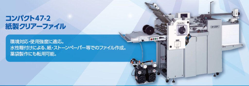 ペーパーファイルは、コンパクト47-2で紙製ファイルを作成する。環境対応・使用強度に適応し水性糊付けによる紙・ストーンペーパー等でファイルを作成。薬袋製作にも転用可能となる。