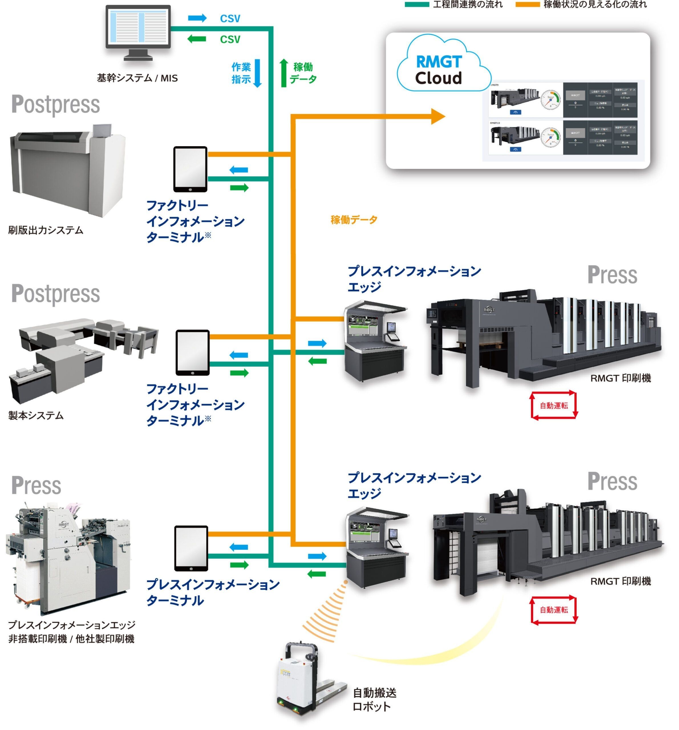 ジョブの受け取り、稼働状況の送信等、基幹システムと自動連携するシステムで、他社機との接続も可能。プレスインフォメーションクラウドへの稼働状況の自動配信を行います。
