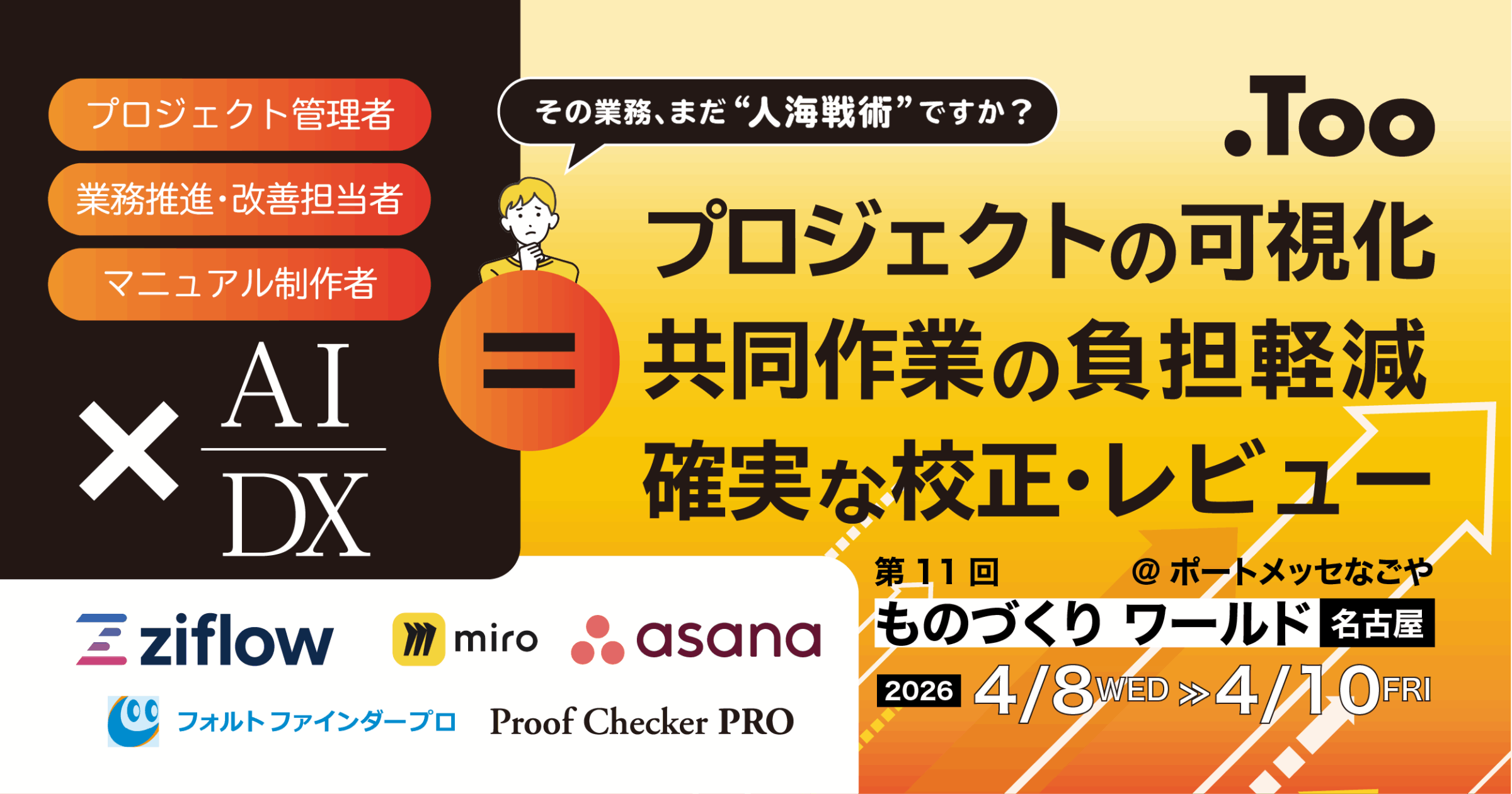 クリエイティブ市場の総合商社・株式会社Tooは、4月8日~10日にポートメッセなごやで行われる「ものづくり ワールド 名古屋」内で開催する「製造業DX展」に出展する。