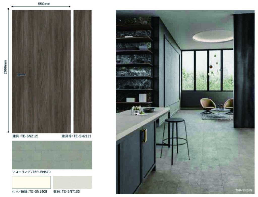 2024年から2025年のインテリアスタイルを、キーワードを交えながら3つの軸で紹介。プレゼン資料などに活用できる。さらにスタイルに合わせた建具、建具枠、フローリング、巾木・額縁、収納のトータルコーディネート案を9パターン掲載。